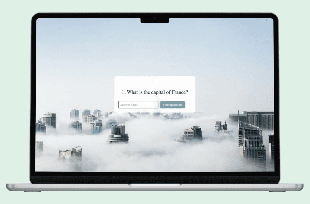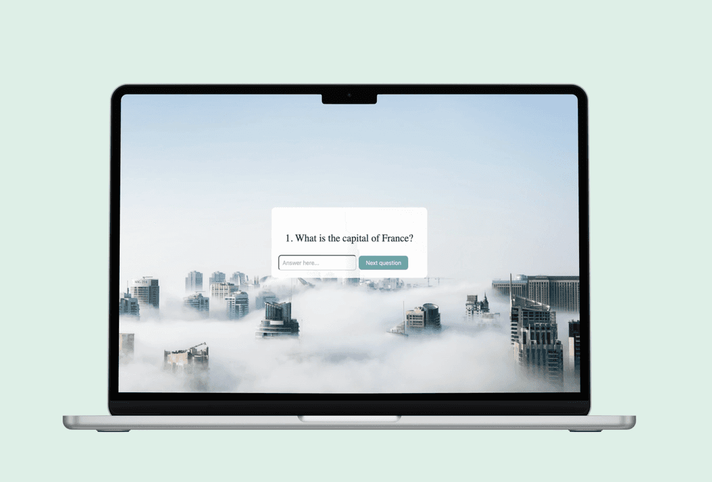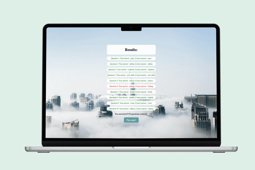 The goal of the project was to design and implement an interactive quiz that tests the user’s knowledge of world capitals. The game was developed using JavaScript, HTML, and CSS, and in the design process I focused on creating a clear user interface and a smooth user experience.