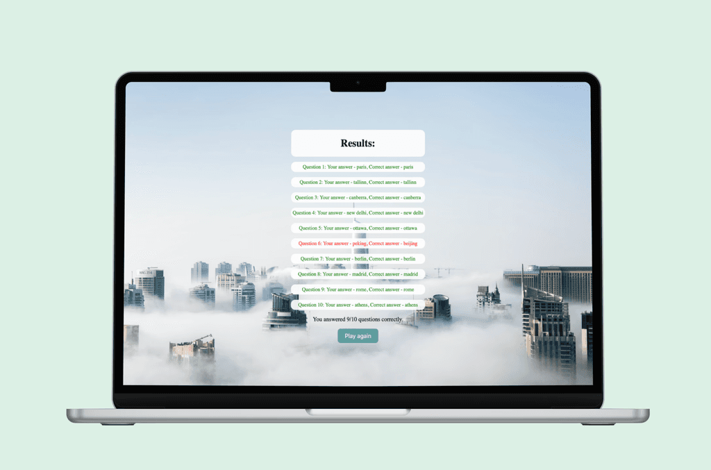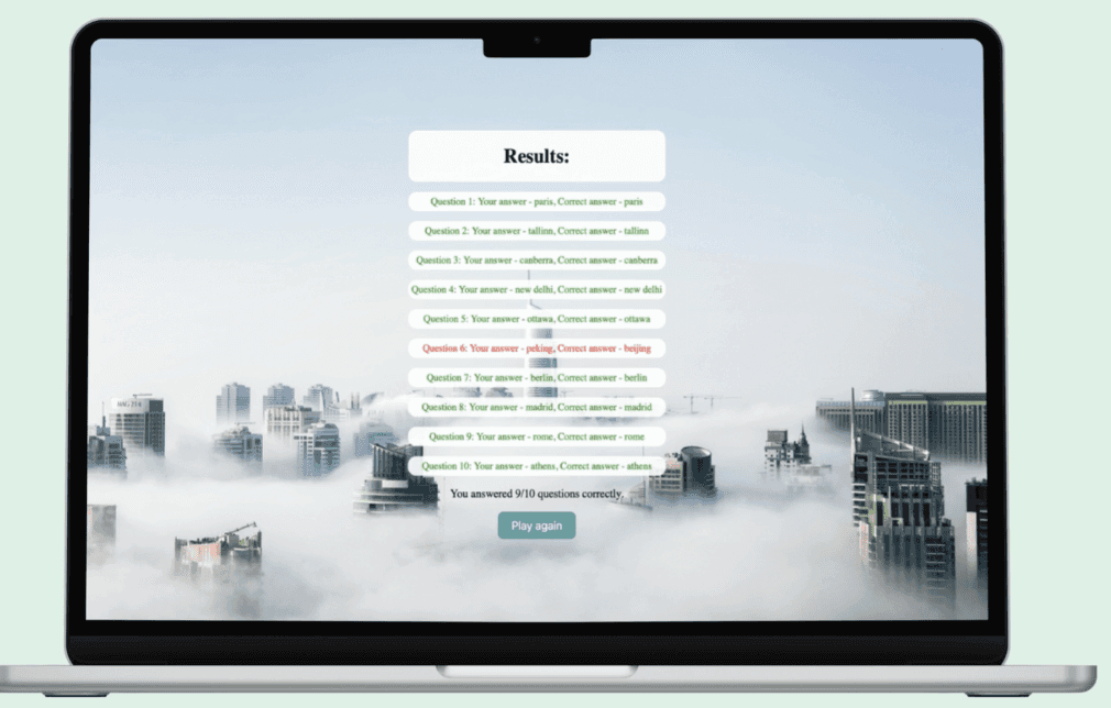 At the end of the game, the user sees the results clearly in a visual format: correct answers are highlighted in green and incorrect ones in red. This provides instant feedback and helps the user understand their own level of knowledge. The results view is designed to enhance the user experience and provide a rewarding visual conclusion to the gameplay. In addition, a “Play Again” button has been added to the interface, allowing the user to restart the game seamlessly.